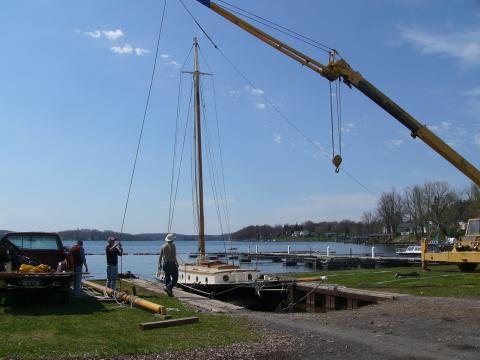 On a chill and windy day while still in the travel lift slip Sara B got her lead ballast back, most of it being put in place by Chris and Sue though Rich also lent a hand the next morning to finish up. Jerry, the marina manager, managed quite nicely with his first big old leaky wooden boat launch experience, and after a couple of days of 'soaking' Sara B got her spars stepped on Saturday, the engine fired right up, and she chugged off to her dock at the Pleasant Beach Hotel. Rich went aloft (twice) to get the fouled halyards squared away and then to attach the triatic. Then a few days later he went up one more time to fix the fouled monofilament. So we had lots of practice getting him aloft. He says he likes it up there. I guess so! I was over at the boat yesterday and though purple martins were sitting on Titania's mast head, nobody was on the triatic.